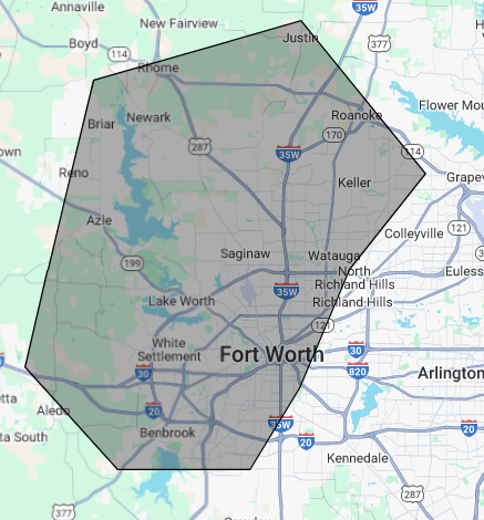 Below is a mapped view of our coverage area. If you are outside of this area please give us a call at 817 513 8355